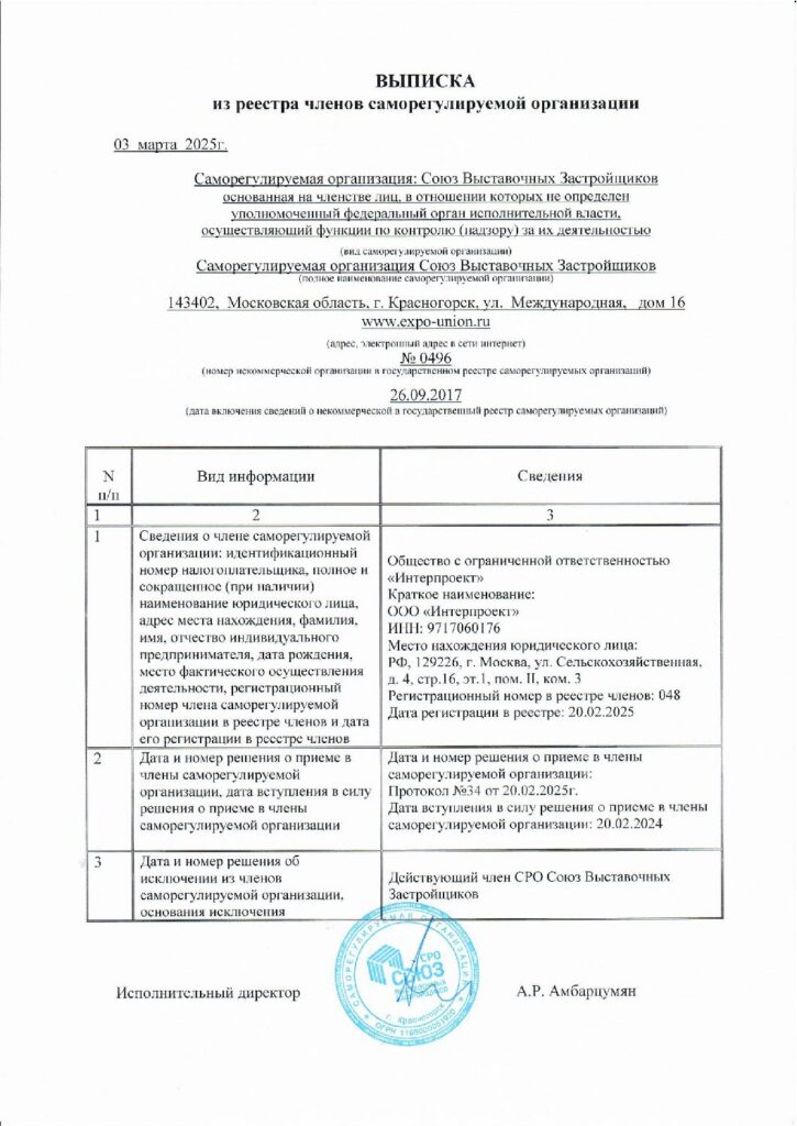 Благодаря четкому планированию, оперативному решению возникающих вопросов и творческому подходу, предложенному сотрудниками ООО "ИНТЕРПРОЕКТ", наш стенд стал одним из самых посещаемых на выставке. Особую благодарность выражаем менеджеру Жуковой Кристине Алексеевне, менеджеру Кохан Анастасии Руслановне, шефу монтажа Левчуку Денису Игоревичу за непосредственное участие в проекте, своевременное решение вопросов и качественное выполнение работы.